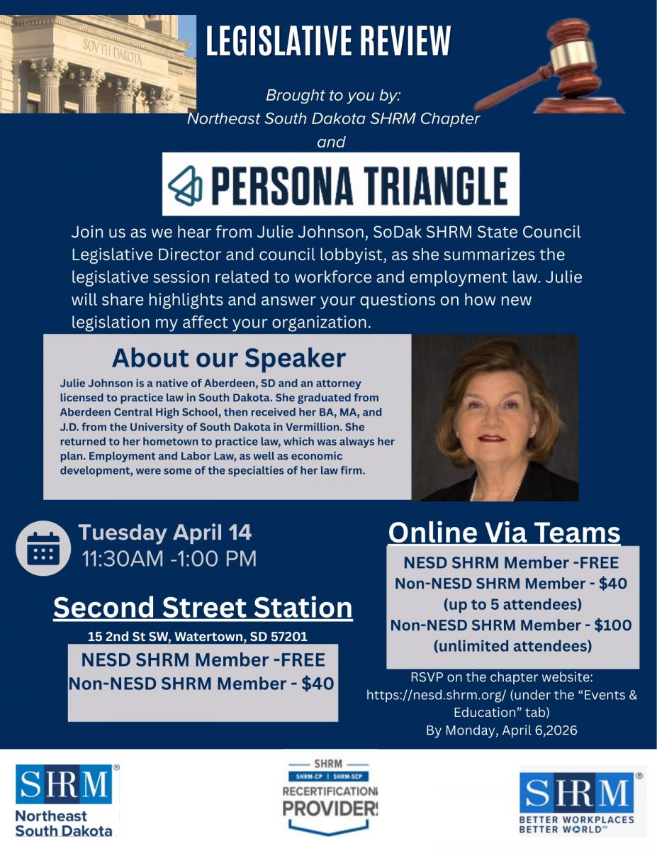 Join us as we hear from Julie Johnson, SoDak SHRM State Council Legislative Director and council lobbyist, as she summarizes the legislative session related to workforce and employment law. Julie will share highlights and answer your questions on how new legislation my affect your organization.